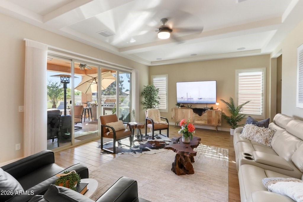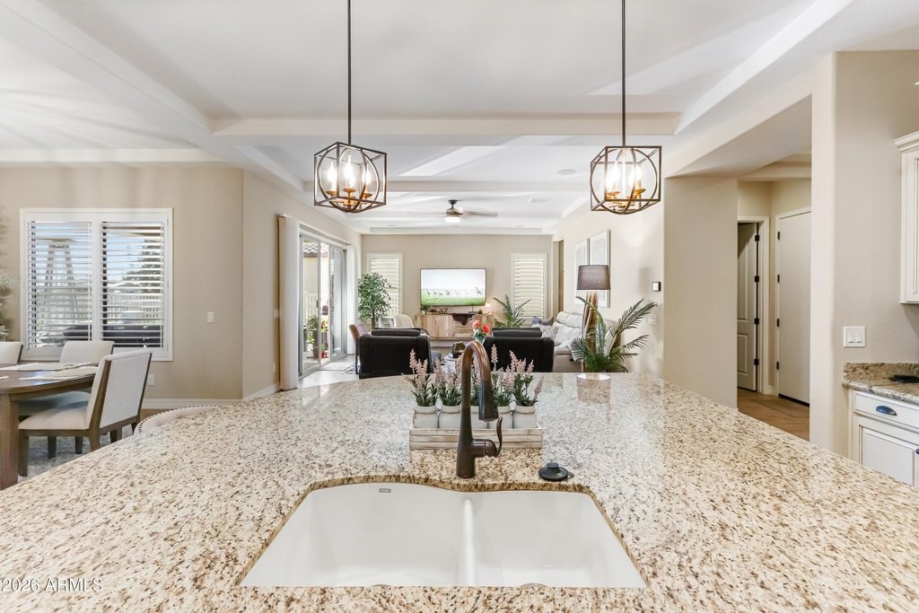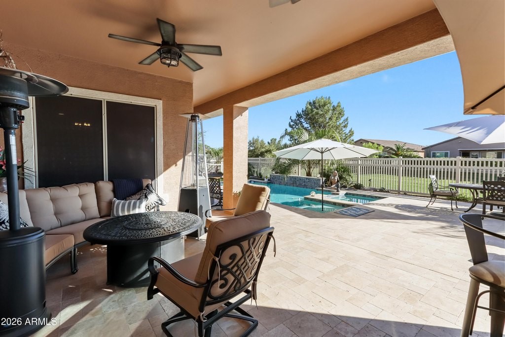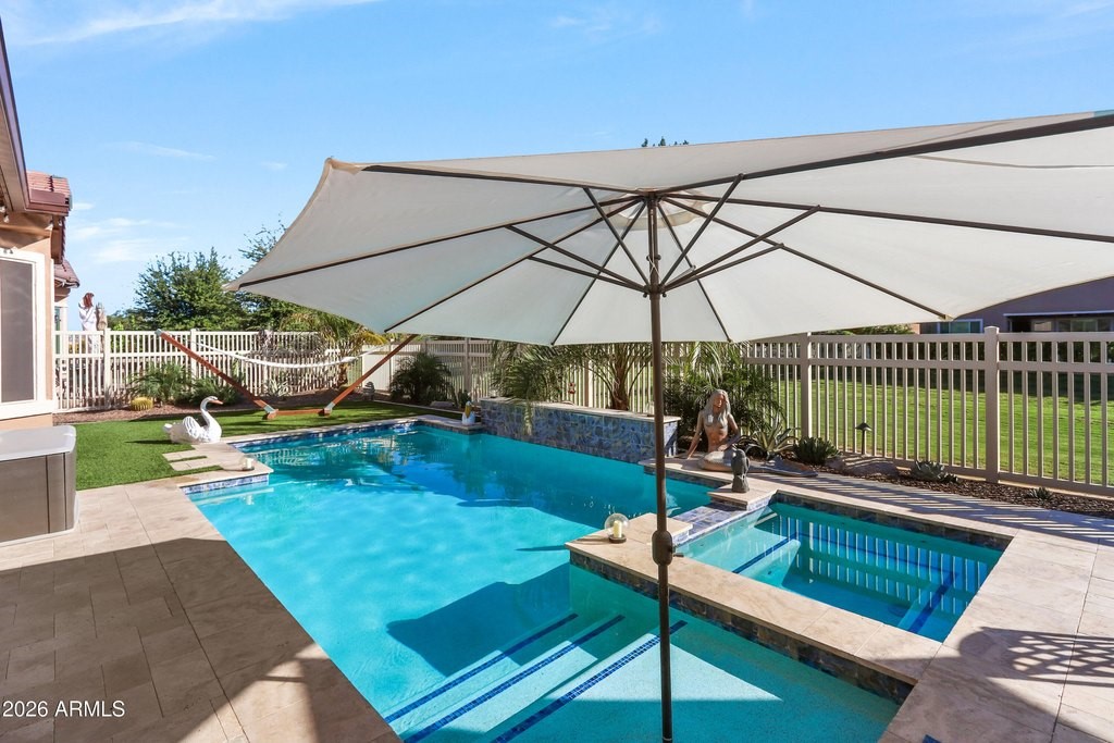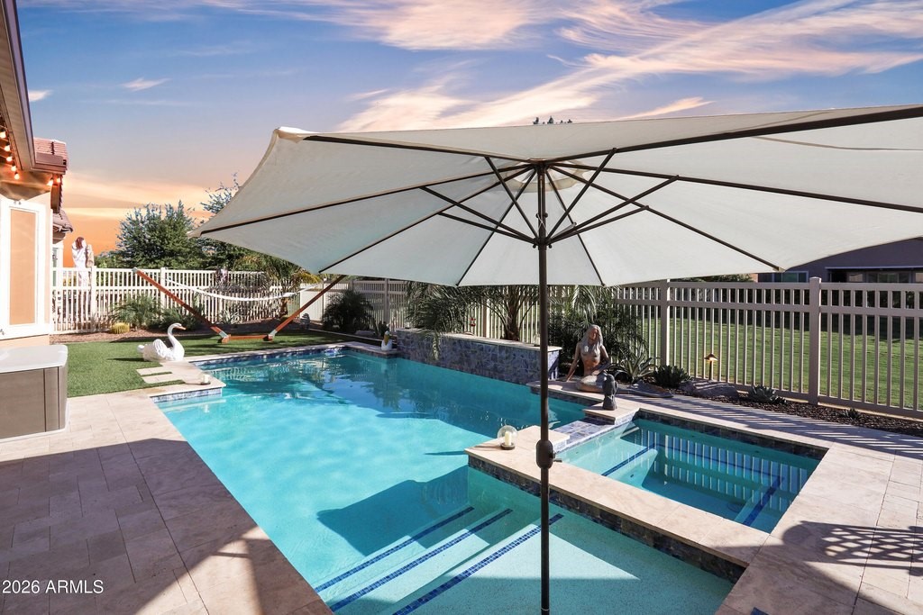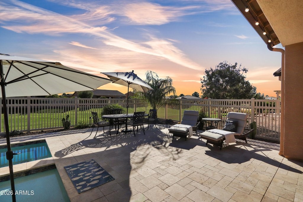 Exquisitely upgraded single-story home in the prestigious 55+ gated community of Province, featuring 3 beds + den, 3 baths, and a rare 3-car garage. Popular Simone floor plan with open-concept design, tray ceilings, tile plank flooring, and plantation shutters throughout. Gourmet kitchen with granite countertops, stacked cabinetry, gas cooktop, oversized island, butler's kitchen, and walk-in pantry. Spacious primary suite with spa-like bath, dual sinks, soaking tub, and walk-in shower. Enjoy a private south-facing resort-style backyard with extended covered patio, travertine tile, heated POOL, and SPA. Additional highlights include surround sound, recessed lighting, water softener system, and numerous quality upgrades throughout. Luxury living at its finest.
